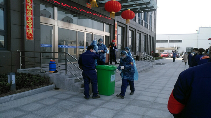 發(fā)熱員工被救護(hù)車運(yùn)送出廠區(qū)后,乙班班長(zhǎng)封安帶領(lǐng)員工對(duì)隔離間進(jìn)行消殺。消殺、救護(hù)工作全部完成后,員工將防護(hù)服、口罩等防護(hù)用品全部按規(guī)定丟入廢棄物垃圾桶,作密封保存待處理。